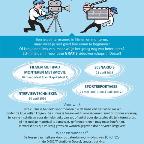Wil je graag leren filmen en monteren? Wil je graag Dessel of je vereniging in de kijker kunnen zetten met een filmpje? Neem dan zeker deel aan de workshops die georganiseerd worden door DIGICAT (de Desselse gemeenschapstelevisie) en STORA, in samenwerking met de gemeente Dessel, afdeling info en vrije tijd. In 6 zaterdagvoormiddagen leer je de basis van verschillende aspecten van het filmmaken, van ervaren lesgevers, experten in hun vakgebied.