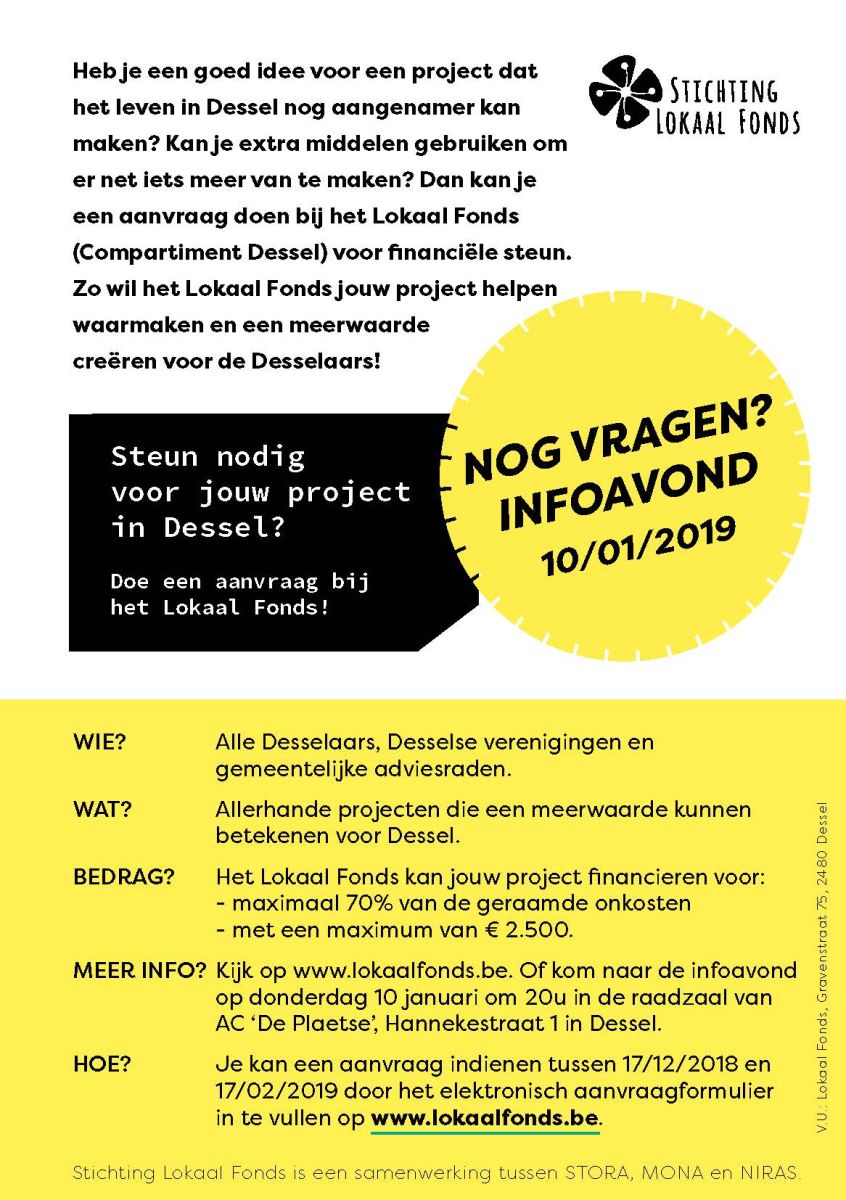 Dit is de eerste open oproep van het Lokaal Fonds, Compartiment Dessel. De volgende open oproep is in principe voorzien in de tweede helft van 2019. Wanneer er meer middelen beschikbaar zijn, zullen er naast dergelijke ‘open oproepen’, ook oproepen komen die gericht zijn op specifieke thema’s.